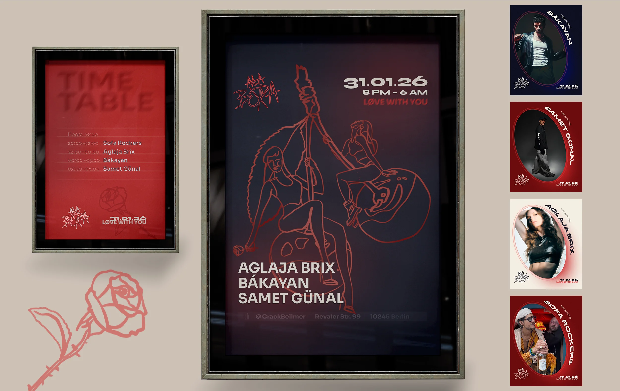 ALA BØRA is a vibrant Berlin-based house music event series and collective that emerged from Bákayan's celebrated release. Rooted deeply in the city's electronic music scene, the collective creates genuine community united by creativity, emotional authenticity, and boundary-pushing house music. As the in-house designer for ALA BØRA, I develop unique visual concepts for each event edition, creating a consistent yet ever-evolving visual language that captures the raw, potent emotion and electrifying energy of Berlin's nightlife.